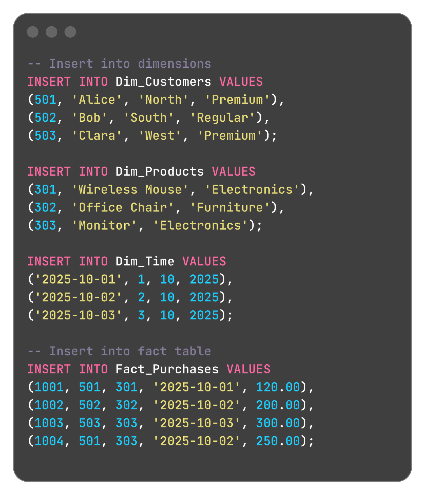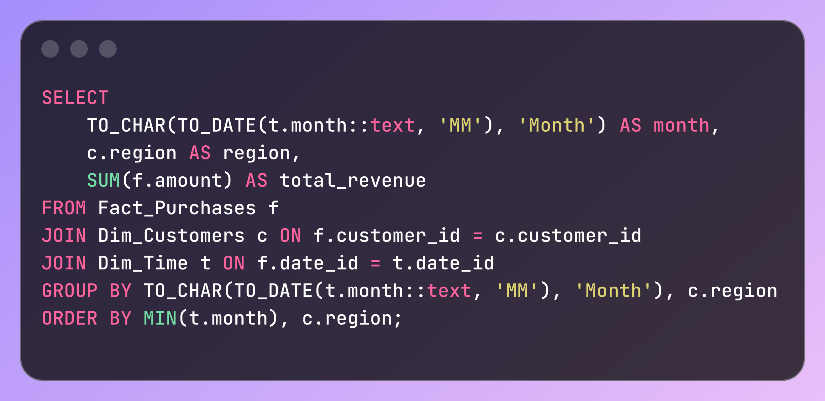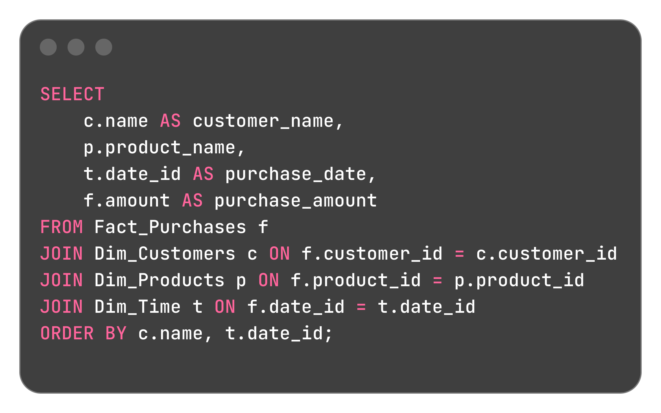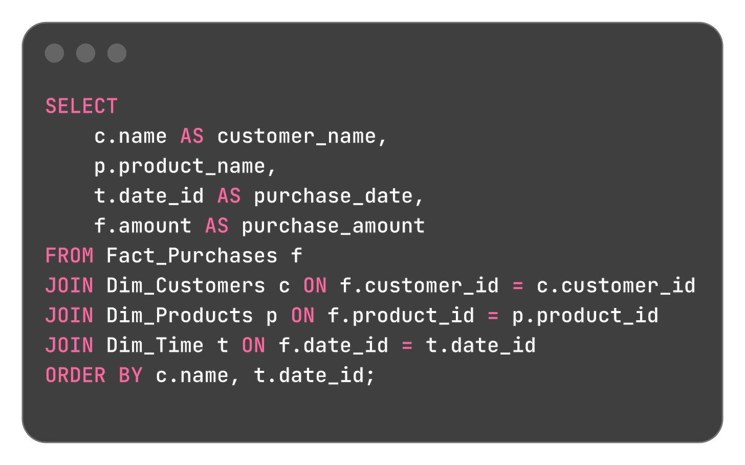 This complete query sequence, from start to end models customer purchases cleanly, showcasing how the fact table logs each order and the dimension tables describe who, what, and when.