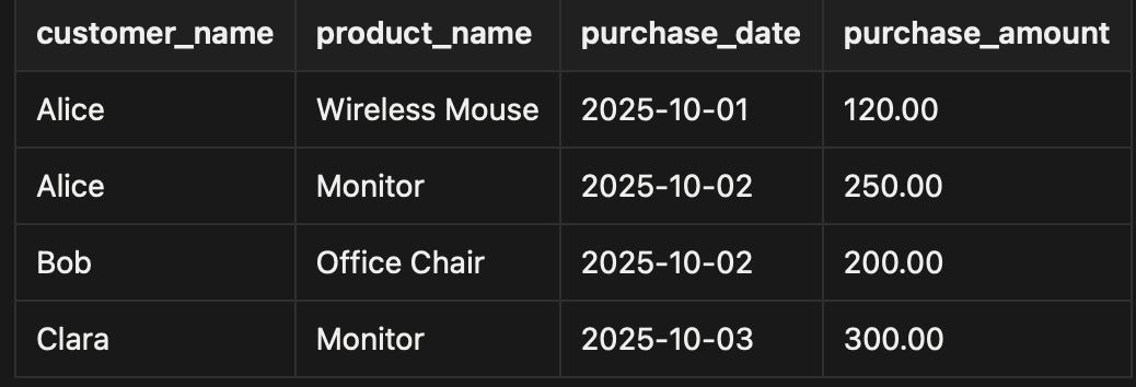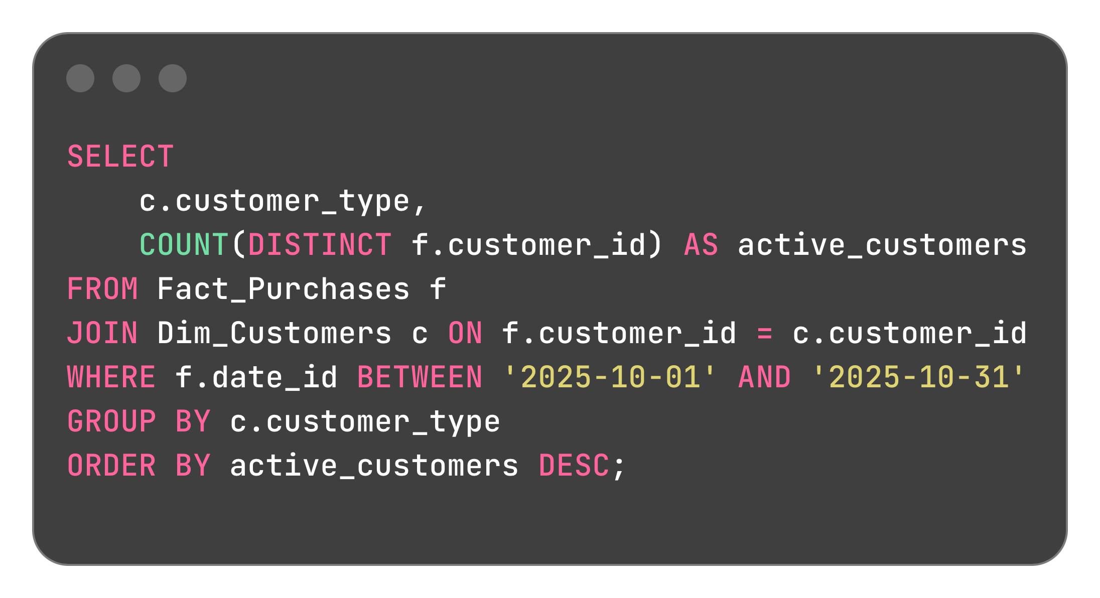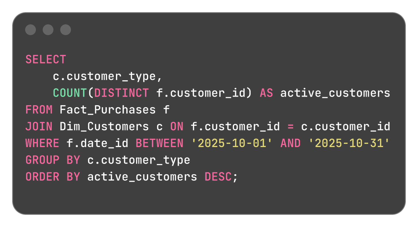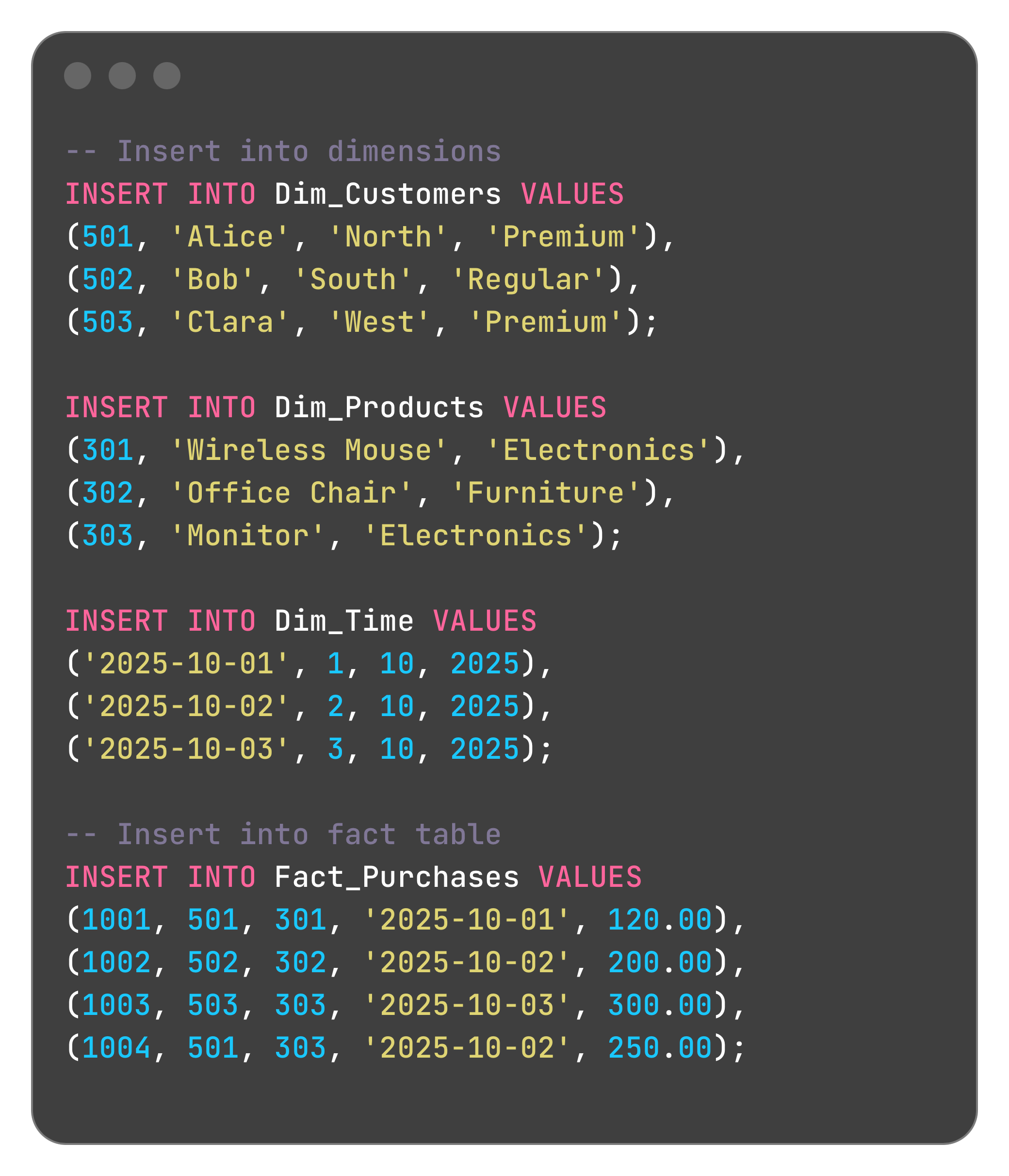This complete query sequence, from start to end models customer purchases cleanly, showcasing how the fact table logs each order and the dimension tables describe who, what, and when.