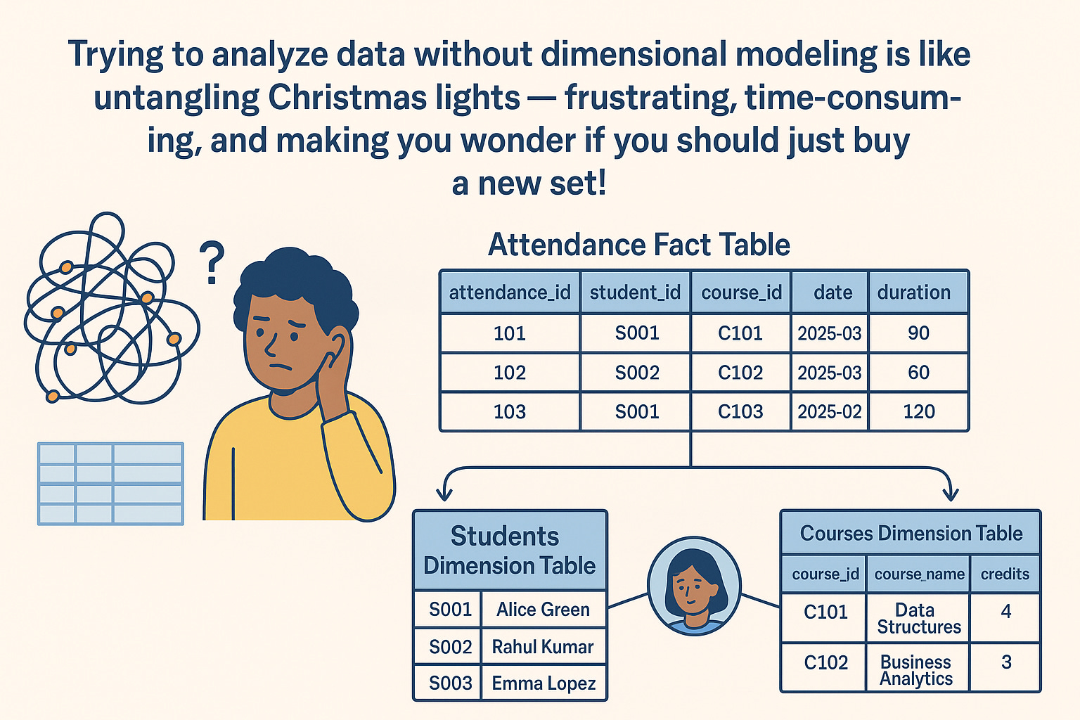 “Trying to analyze data without dimensional modeling is like trying to untangle Christmas lights frustrating, time-consuming, and making you wonder if you should just buy a new set!”