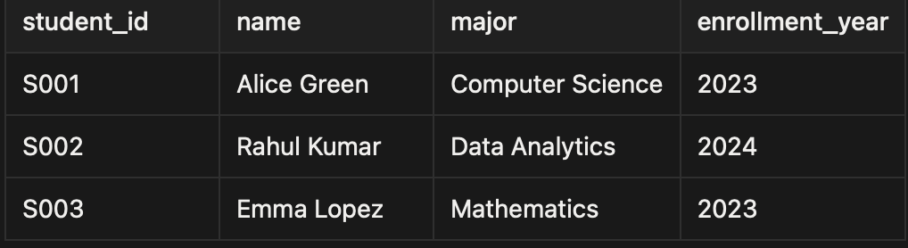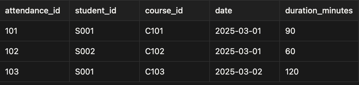 student_attendance.student_id→students.student_idstudent_attendance.course_id→courses.course_id