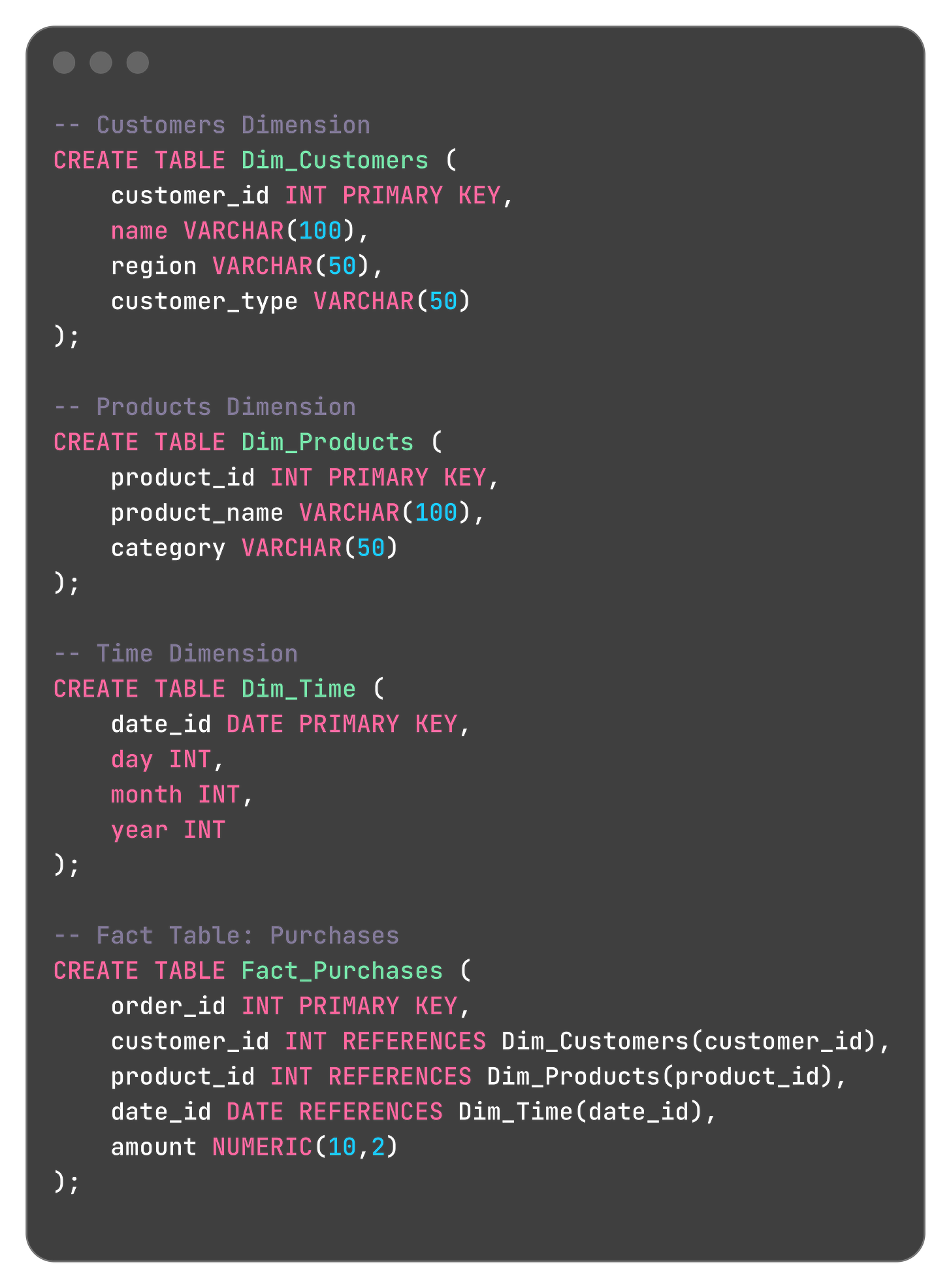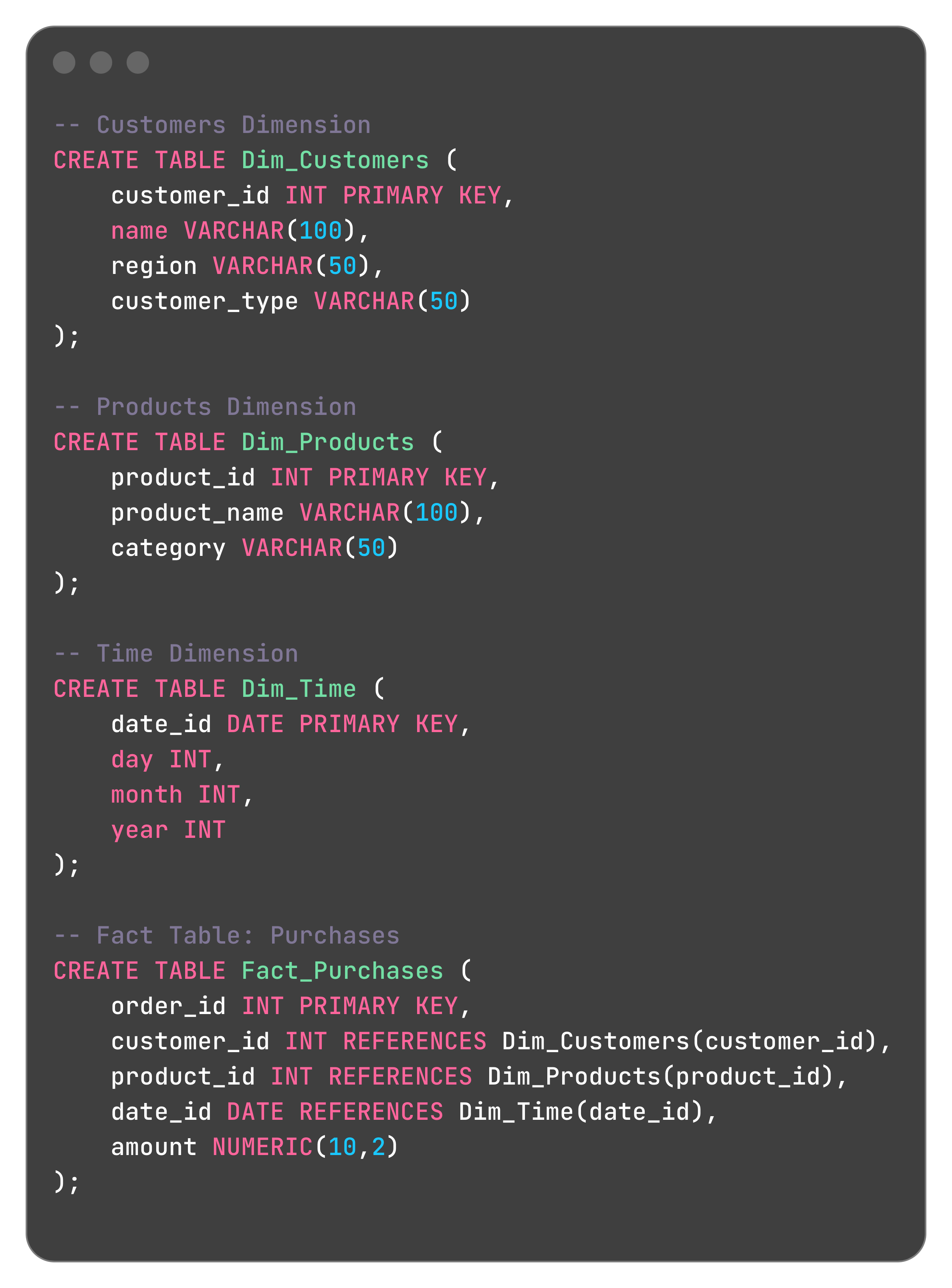 Dimensions: These are the descriptive details or context about the facts, such as time (day, month, year), product (name, category), customer (age, location), or store. Dimensions help you answer questions like “When was it sold?” or “Who bought it?” or “Where was it sold?”